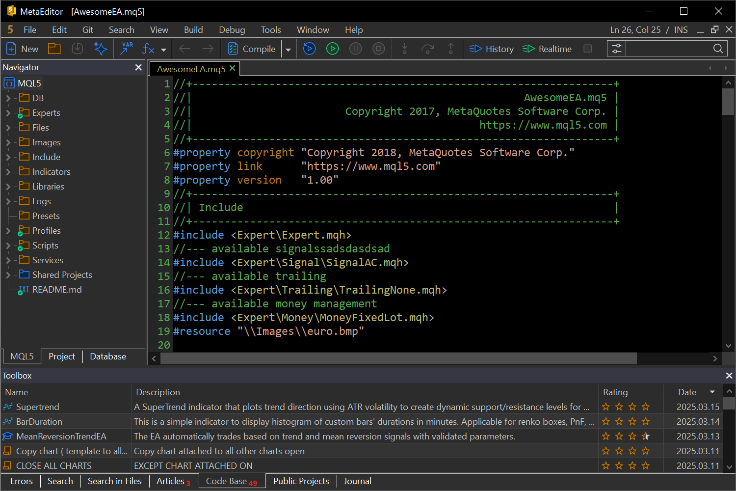 新版 MetaTrader 5 平台 Build 5100:过渡到 Git 和 MQL5 Algo Forge 开发者中心、深色主题和界面改进