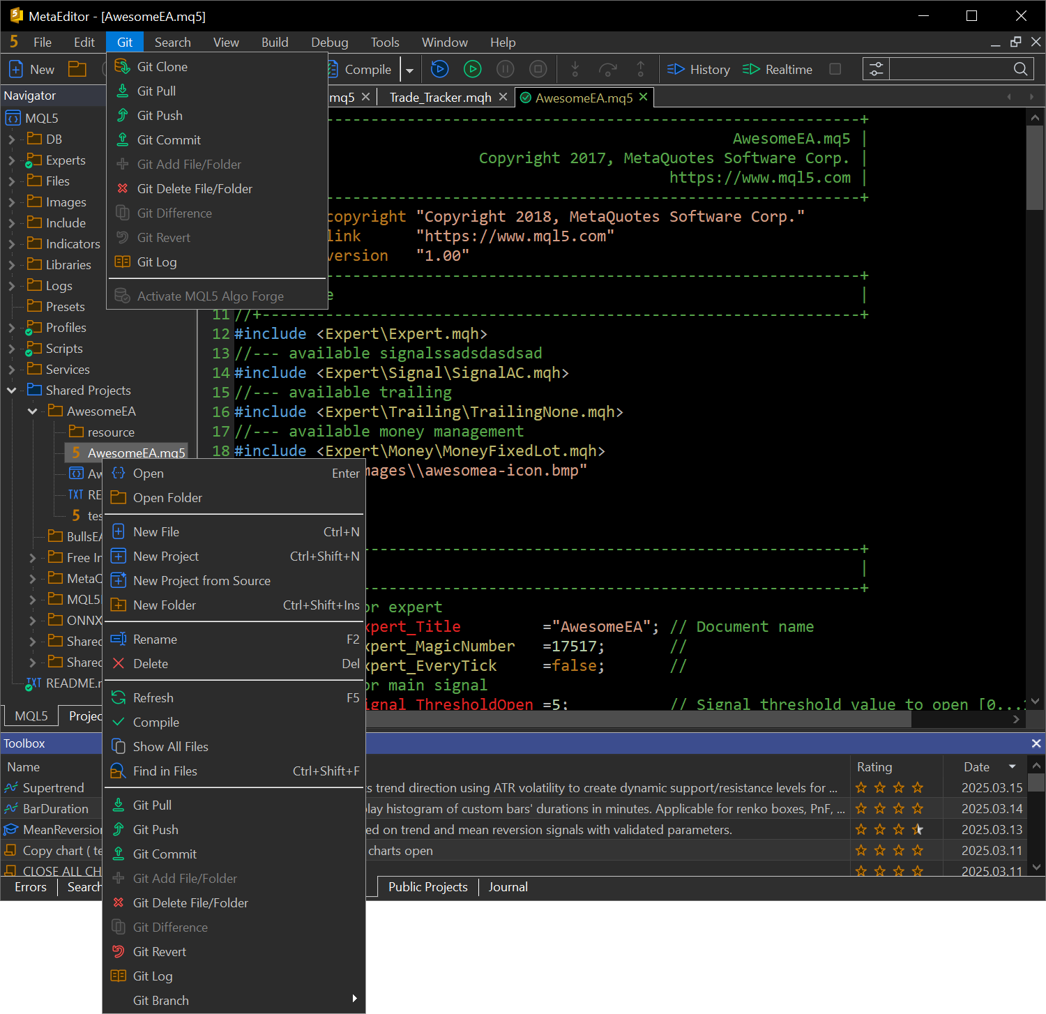 为了提高 Git 的可用性,我们重新设计了导航器和活动代码编辑窗口。我们还在 MetaEditor 工具栏上引入了一个专用的 Git 菜单: